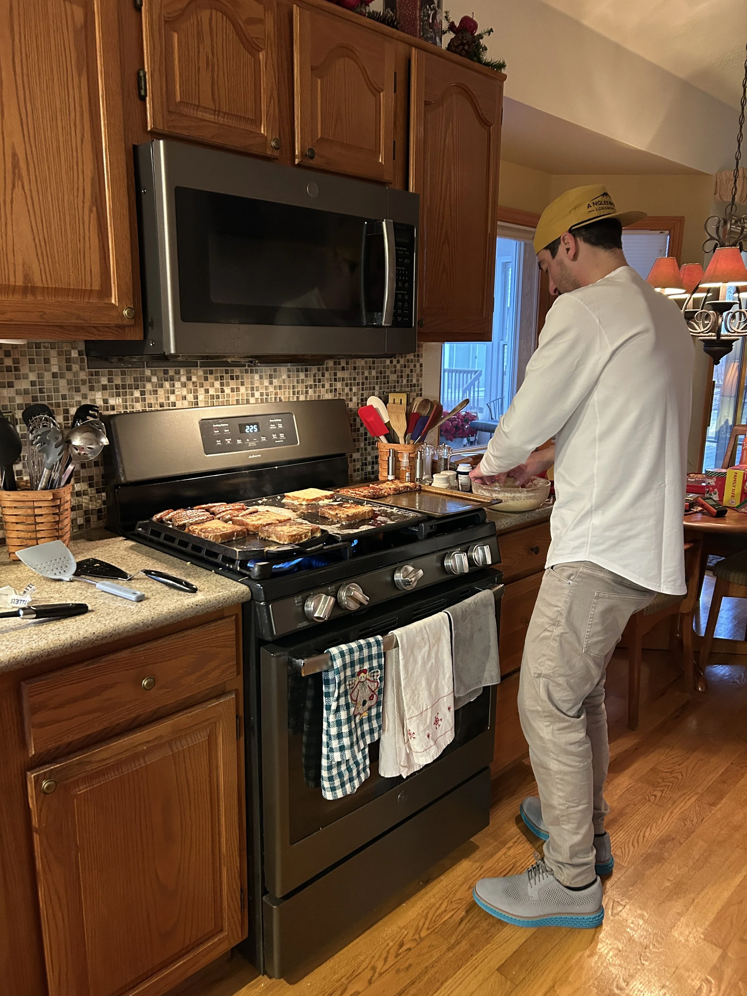 Jason making french toast, dressed up in all his Christmas Gifts. 2024.